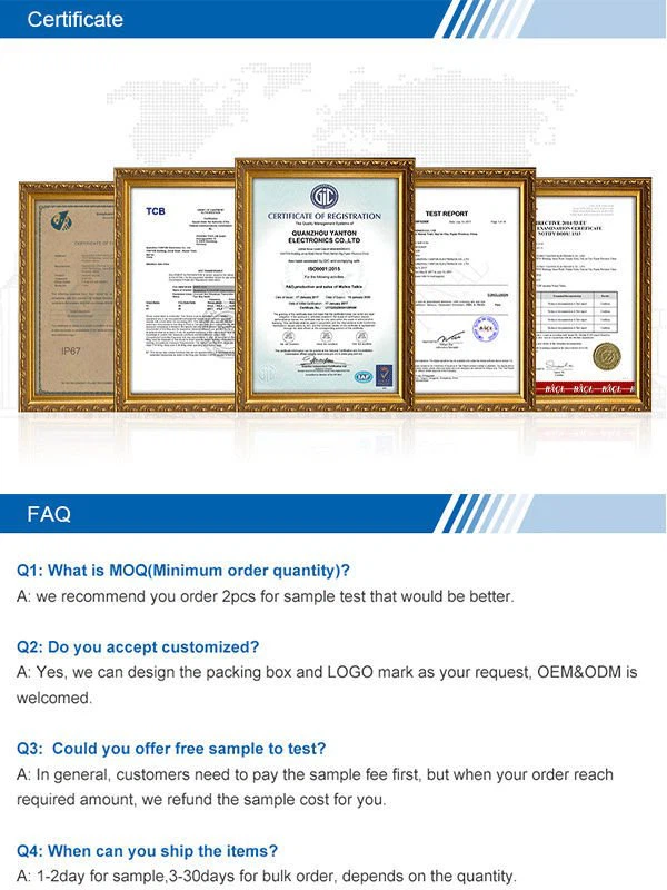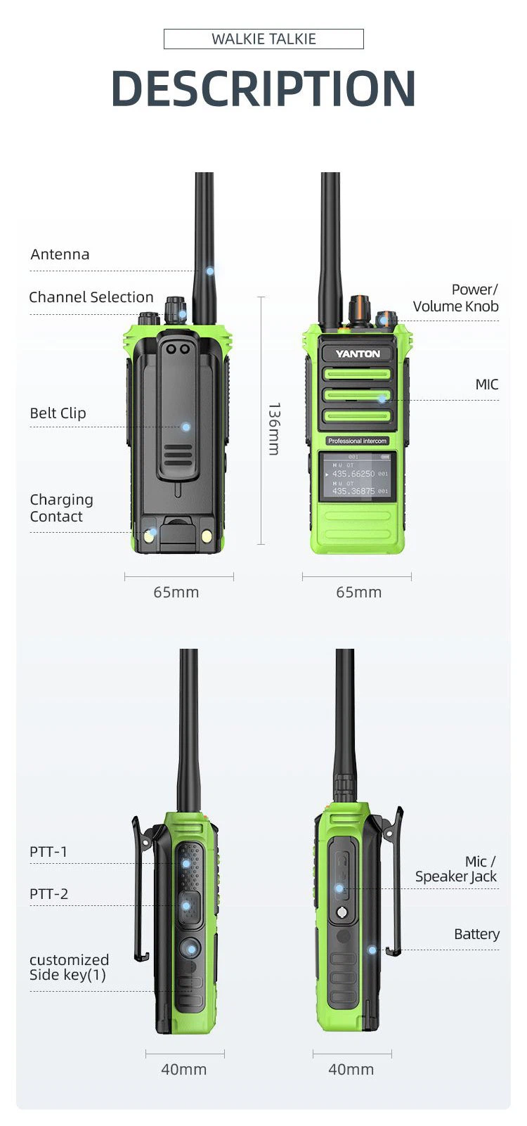 YANTON 10 W suure võimsusega UHF-saatja käeshoitav VHF-meresaatja raadiosaatja kasutab energiasäästlikku kõrglahutusega OLED-ekraani ja uuenduslikku külgmist kahe PTT-d. Realiseeritud on peen välimus, peen struktuur ja lihtne töö.